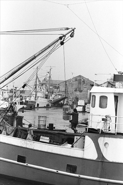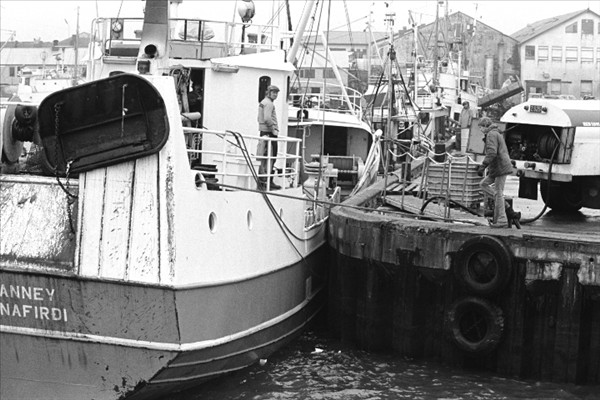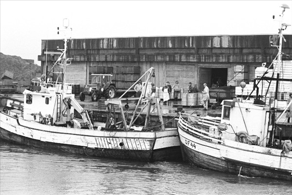 Hér er verið að landa humri í nýja frystihúsið á Höfn. Bátarnir liggja fyrir framan frystihúsið og tunnunum er ekið lá lyfturum í kæligeymsluna, þar sem humarinn bíður vinnslu. Þá má sjá hvar verið er að taka ís og gera klárt fyrir næsta róður.