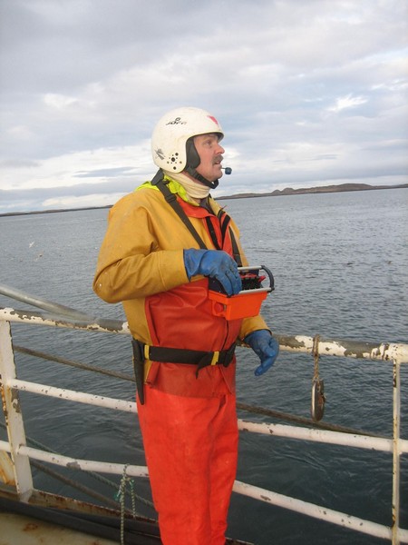 Spáð í spilin áður en lagt var af stað með bátinn til sjávar. Þarna má m.a. sjá Sigurð Stefánsson, kafara o.fl., Ragnar Emilsson, skipstjóra, Hörð Óskarsson og Haukur útgerðarmaður snýr baki í okkur