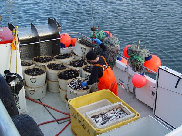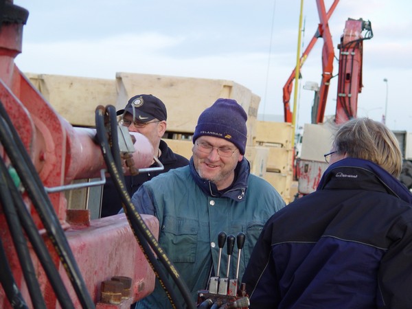 Fyrsta verk eftir að komið er að bryggju er að hífa bjóðin í land
