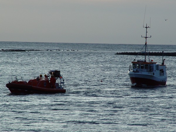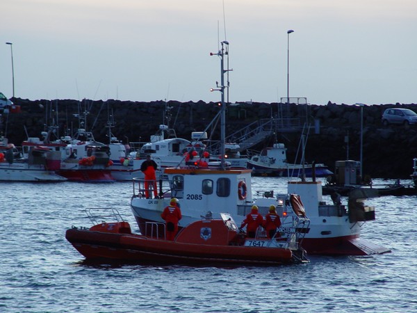7647. Þorsteinn, björgunarbátur með 2085. Guðrúnu GK 69 í togi í innsiglingunni til Sandgerðis í dag