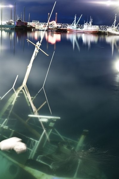 Frá björgun Svans KE 90 í Njarðvíkurhöfn í morgun. Til að sjá samanburðinn á myndatöku á venjulegan máta og með næturstillingunni eru tvær síðustu myndirnar teknar við sömu aðstæður © myndir Emil Páll 30. desember 2009