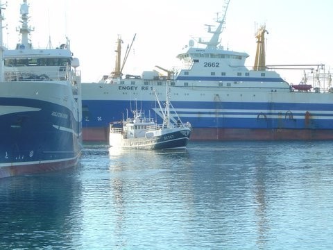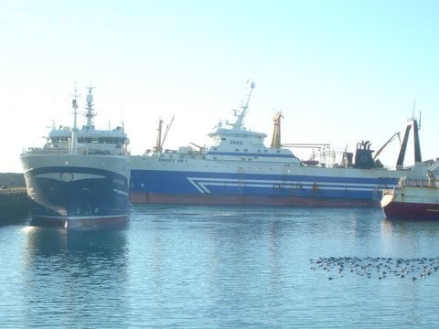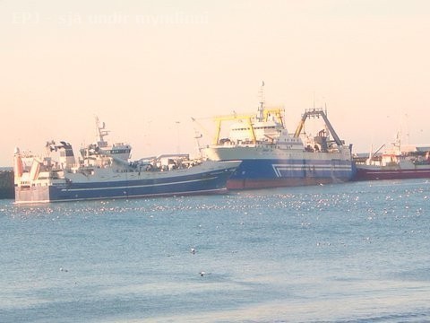 Þessar myndir eru nánast perlur, því mjög sjaldgæft er að hafa náð þessu saman. Myndirnar sendi Júlíus V. Guðnason og er teknar uppi á Akranesi í feb. eða mars 2005. Sýna þær Engey RE 1 að frysta loðnu, Aðalstein Jónsson SU 11 að sækja varahluti og Hannes Andrésson SH 747 nýkominn úr Sæbjúgutúr. - Sendi ég Júlíusi bestu þakkir fyrir.