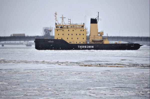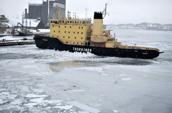 Þegar Ísabrjóturin Thorbjörn var settur í aktion nú í morgun með að brjóta ís í höfninni í