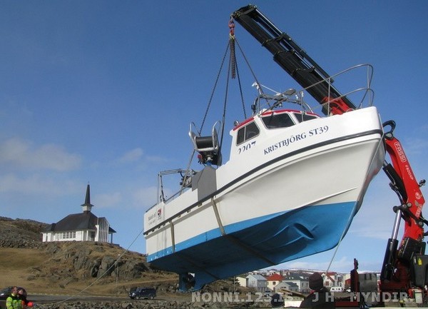 2207. Kristbjörg ST 39 hífð af flutningavagninum og í sjóinn á Hólmavík í dag