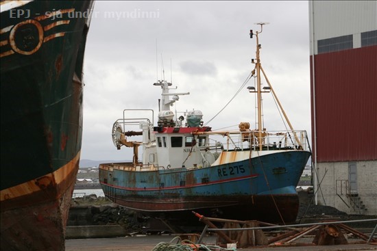 Hér birtast þrjár myndir af því er Njáll RE 275 kom í morgun að slippbryggjunni í Njarðvik og eins þegar hann var á leið upp slippinn í sleðanum.