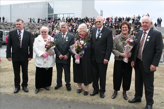 Á sjómannadaginn í Grindavík í gær voru þeir Halldór Ingólfsson, matsveinn á Verði EA, Ölver Skúlason, fyrrum skipstjóri á Geirfugli GK og Jón Ragnarsson fyrrum skipstjóri á Verði ÞH. heiðraðir. Þeir eru hér á myndinni eftir athöfnina ásamt eiginkonum sínum og Ólafi Erni Ólafssyni bæjarstjóra sem heiðraði þá fyrir hönd Sjómanna- og vélstjórafélag Grindavíkur © mynd Kristinn Benediktsson, 6. júní 2010