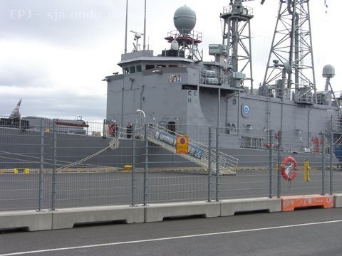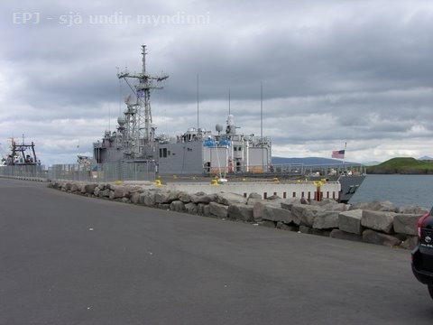 ... svo lá leiðin niður í Sundahöfn en þar lá einn rússi og fyrir aftan hann herskip frá Bandaríkunum og lá mér hugur að mynda það. Ég ók meðfram girðingunni þarna og stoppaði á móts við skipið og var að taka myndir er starfsmaður Securitas kom að bílnum og hóf að spyrja mig um erindi mitt þarna,ég sá enga ástæðu aðra en að vera jafn almennilegur og hann og svaraði honum greiðlega, þá tjáði hann mér að bandaríkjamennirnir um borð yrðu órólegir ef eitthver stoppaði þarna sem ég var (sem var utan girðingar og hvergi merkt að bannað væri að stoppa eða taka myndir, enda utan varnargirðingarinnar) og jafnframt tjáði hann mér að um leið og ég stoppaði hefðu 2 skyttur um borð beint hlöðnum byssum að mér og væru tilbúnnir að skjóta á mig, ja hver andskotin datt uppúr mér,enda fannst mér þetta vera fjandi óþægilegt að vita af, en öryggismaðurinn var hinn almennilegasti og eftir stutt spjall kvaddi ég og fór, en ónotatifinningin hvarf ekki fyrr en ég var kominn af bryggjunni.
