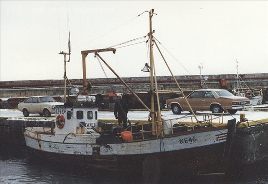 Hér sjáum við bát einn sem þarna var ný sjósettur í Njarðvik, þar sem hann var smíðaður. Þessi sami bátur var seldur úr landi á síðasta ári og var þekktur fyrir það að vera með einkennisstafina í spegilskrift.