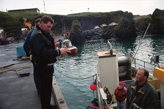 Texti Alfons Finnssonar með þessari mynd var svohljóðandi: Hér er Guðlaugur Wium lögregluþjónn að segja Pétri Péturssyn á Bárði SH eitthvað til syndanna. (bara grín) árið 1992.