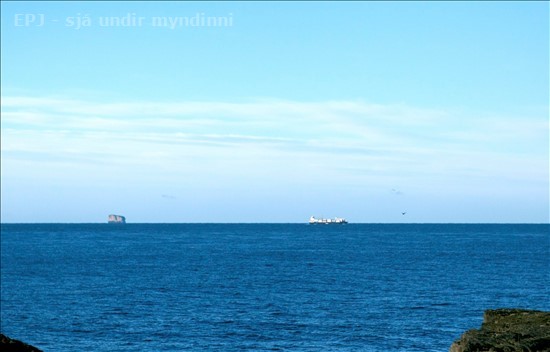 Brúarfoss að skríða út úr Reykjanesröstinni í morgun, ný farinn fram hjá Eldey sem sést til vinstri á myndinni © mynd Guðmundur Falk. 24.okt. 2010