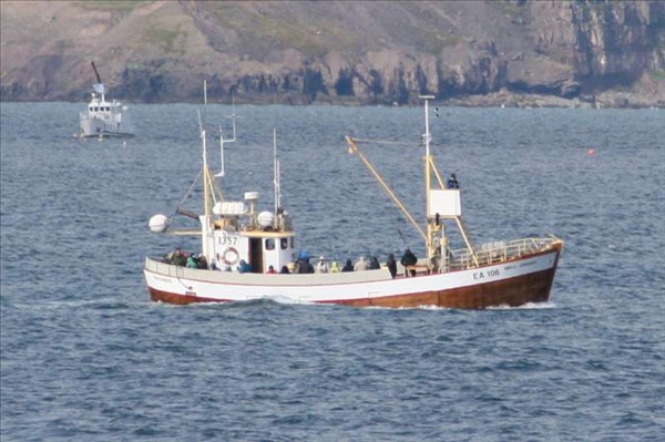 Jóhannes Gíslason eigandi bátsins við hlið hans í morgun © mynd Emil Páll, 22. apríl 2011
