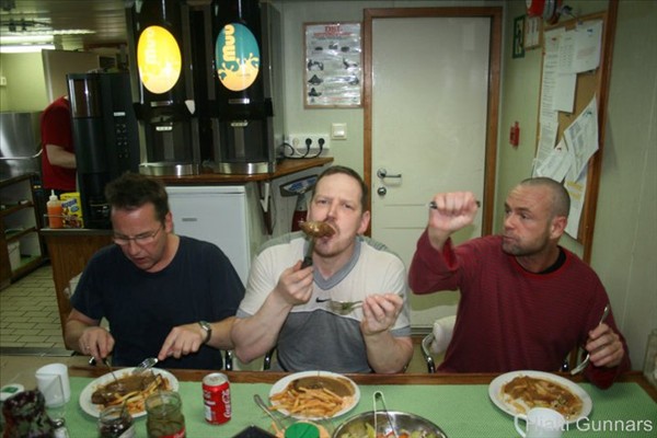 Geiri stýrimaður að næra sig, en Anton og Matti að leika sér að matnum