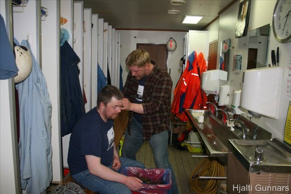 Gúddi rakari, snyrtir heddið á Skúla baader