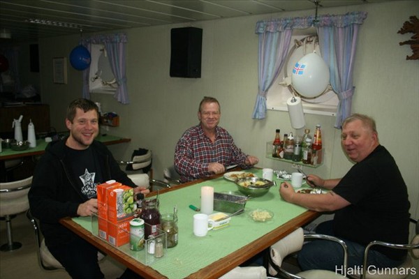 Feðgarnir Örvar og Ægir, ásamt Kristjáni vélstjóra, glaðir yfir matnum á 17. júní