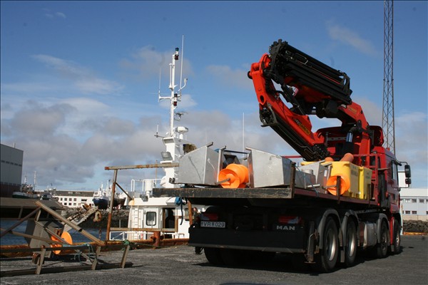 Bíll kominn með makrílgræjurnar að skipshlið í Njarðvik í morgun © myndir Emil Páll, 28. júní 2011