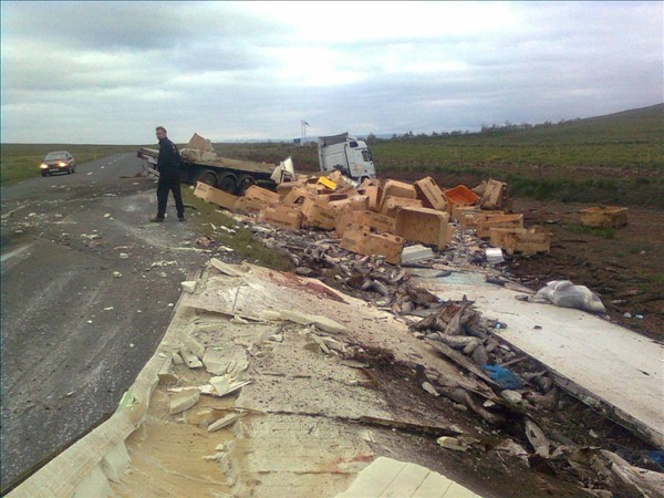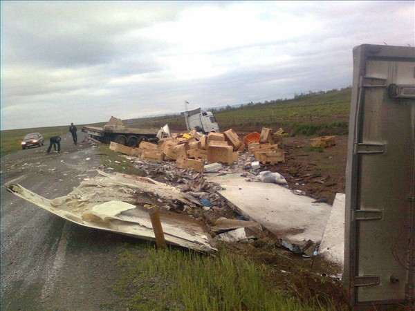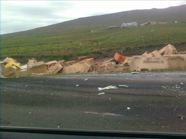 Þorgrímur Ómar Tavsen ók í morgun fram á þetta óhapp í Húnavatnsýslu, en þarna hafði fiskflutningabíll sem var að koma frá Hornafirði og var á leið á Suð-vesturhornið orðið fyrir því að bíllinn fór út af þjóðveginum og farmurinn hreinlega splundraðist eins og sést á þessum símamyndum hans.