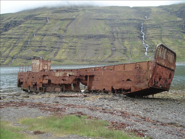 Gamall innrásarprammi sem veður hefur unnið á, auk mannshandarinnar