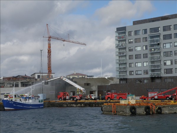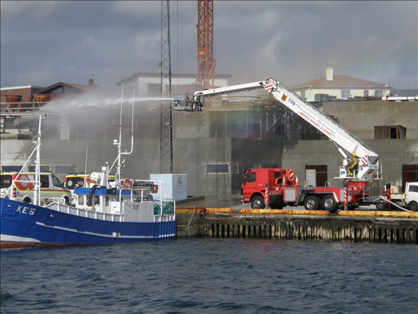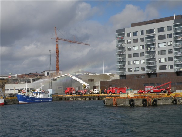 Slökkviliðsæfing hjá Brunavörnum Suðurnesja við Keflavíkurhöfn í gærmorgun og á myndinni sést einnig 1587, Sævar KE 5 © myndir Emil Páll, 23. júlí 2011