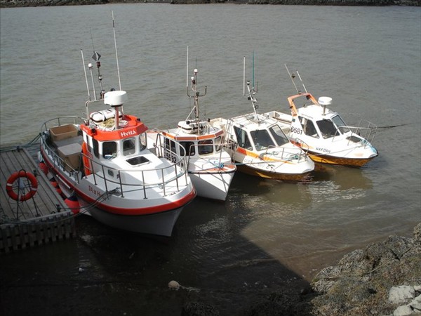 Hér er Holmvag, Fröyskjær og síðan sést aðeins í Turbo. En sjáið þið hvernig bátarnir er bundnir saman þeir koma aldrei við hvorn annan, því dálítið frá bryggjunni er akkeri sem ysti báturinn er bundinn í bæði að framan og aftan og þannig haldið frá hinum bátunum og þannig kemur innsti báturinn aldrei heldur við bryggjuna. Fröyskjær er bátur sem búið er að gera upp til þess að búa í og sigla um ströndina.