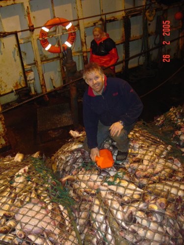 Kallinn ánægður með aflann. Þessar myndir eru teknar í feb 2005 og eru settar saman úr þremur veiðiferðum. En veiðimynstrið var alltaf eins hjá okkur þarna steinbítur á nóttunni og leitað að ýsu á daginn. Og þarna var nóg að ýsu hjá okkur og ekkert vandamál að fiska hana eins var með steinbítinn nóg var af honum þarna útaf Kópnum.