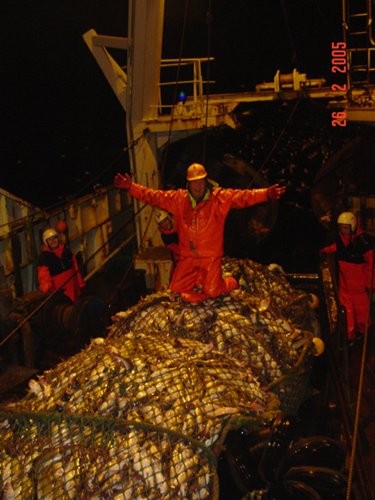 Hér stýrimaðurinn sjálfur á toginu og allt orðið rautt hjá honum og ekkert annað í stöðunni en að hífa.