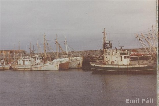 848. Sigurvon SH 121, (sá guli) við gömlu steinbryggjuna í Stykkishólmi um 1980 © mynd Sigurbrandur