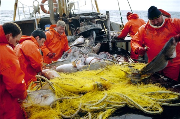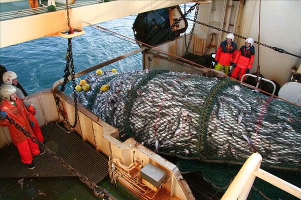 Trollveiðar: 20 tonna hal tekið inn á togaranum Verði EA frá Grenivík sem var að toga trollið grunnt út af Reykjanesi vorið 2011.