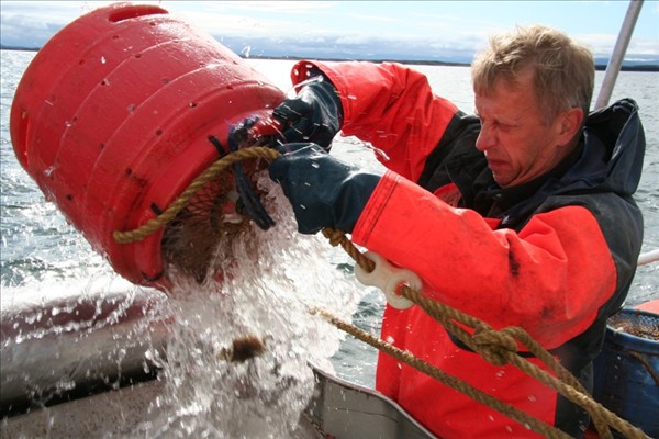 Beitukóngsveiðar: Arngrímur, skipstjóri á Garpi SH frá Grundarfirði, tekur á móti beitukóngsgildru og réttir hana við á vinnuborðinu haustið 2006.