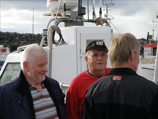 Smábátamenn komu nokkrir til að kveðja Steingrím áður en hann færi til Akureyrar og var oft kátt á hjalla með þeim og hér sjáum við þrjá þeirra, en ég mun þó aðeins nafngreina tvo þeirra þ.e. f.v. Jón Halldór Björnsson og Steingrímur Svavarsson. Hinn, sem er sá sami og réðist á mig fyrir myndatökur í Grófinni á sínum tíma, tróð sér þó inn á myndina, en ég mun að augljósum ástæðum ekki nefna nafn hans, hann á það ekki skilið, meðan engin afsökun komið frá honum © myndir Emil Páll, 2. sept. 2011