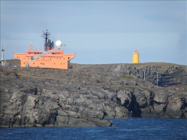 Brúin á Torm Gunhild kemur upp fyrir bergbrúina á Hólmsberginu og síðan sjáum við líka Hólmsbergsvita © mynd Emil Páll, 21. sept. 2011