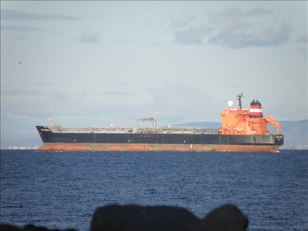 Hér er lóðsinn farinn frá borði og oliu skipið tekur stefnuna út Stakksfjörðinn á sjötta tímanum í kvöld.