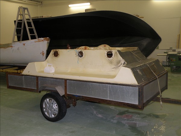 Neðri hlutinn af hjólabáti, á grúfu, í kerru í húsi hjá Sólplasti ehf., í Sandgerði © mynd Emil Páll, 21. okt. 2011