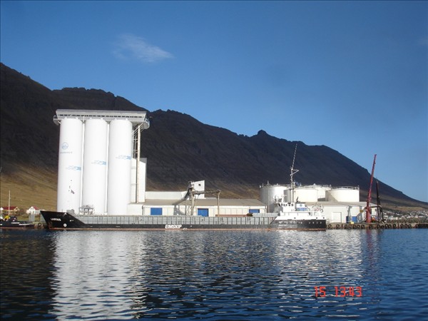 Laxfoss lestaði mjöl í morgun á Neskaupstað og fór síðan um tvöleitið © myndir Bjarni G., 15. okt. 2011