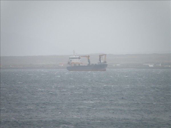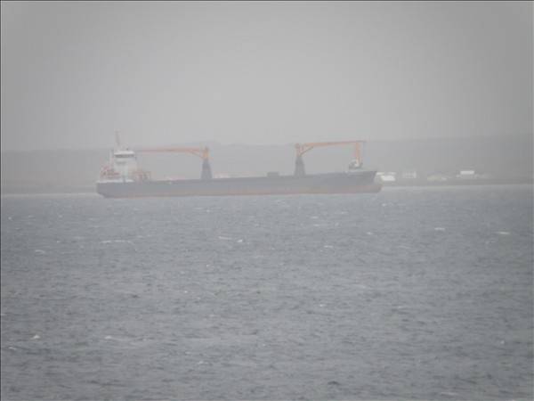 Þegar aðeins betra skyggni kom smellti ég aftur mynd af skipinu og hér sjáum við því Onego Arkhangelsk, á Stakksfirði í dag, með húsin í Vogum í baksýn © mynd Emil Páll, 8. okt. 2011
