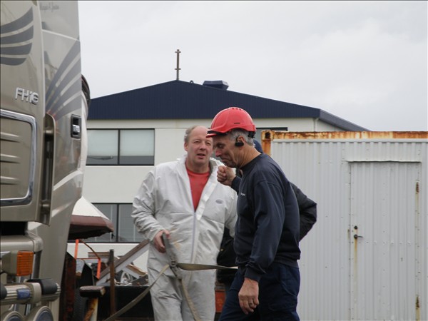 Þessir þrír komu við sögu í hádeginu í dag þegar Sæúlfur var fluttur til Sólplasts í Sandgerði. Þ.e. á flutningabílnum var Margeir Jónsson, eigandi bátsins var Pétur Einarsson og Kristján Nielsen hjá Sólplasti tók við bátnum og mun lengja hann um 1.5 metra.