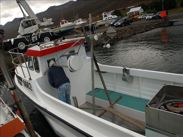 Hér flýtur báturinn, en er þó enn tengdur krananum