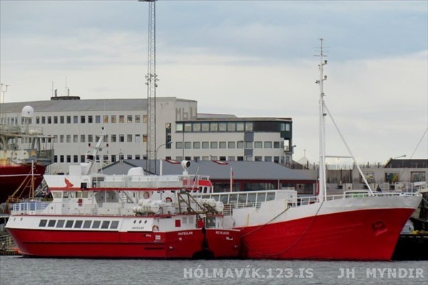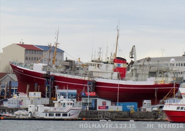 Hér sjáum við hvalaskoðunarskipið Hafsúluna, þar sem hún liggur utan á 1048, sem í upphafi hét Fífill GK, en hefur verið notað sem móttökustöð og sýningasalur hjá hvalaskoðunarfyrirtækinu Eldingu.