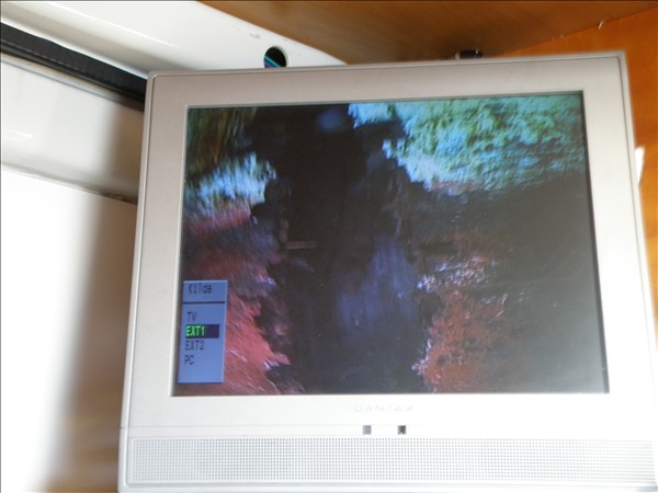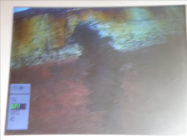 Hér koma myndir sem ég tók nú síðdegis af því þegar kafarar fóru með plötu í sjóinn til að setja fyrir gatið á Sölku GK, í Sandgerðishöfn. Þá sést gatið og fleira af bátnum. Tók ég þær myndir af sjónvarpstæki í bíl Köfunarþjónustu Sigurðar, en kafararnir voru með myndavél með sér sem tók myndir á vettvangi. Gatið er nánast 2ja metra langt og um 90 sentimetra breitt.
