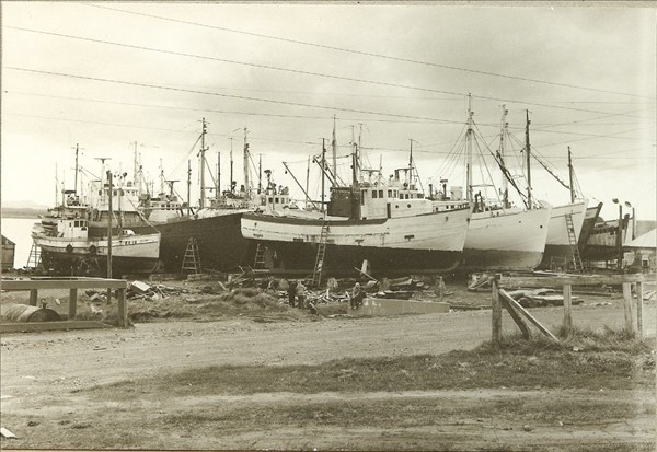 þessi skemmtilega mynd er úr safni Skipasmíðastöðvar Njarðvíkur og sýnir marga báta samtímis í slippnum.