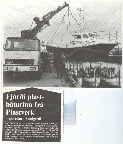 Þessa úrklippu fékk ég að láni úr einkasafni Kristjáns Nielsen í Sólplasti, en hún birtist í blaðinu Reykjanesi, trúlega einhvern tímann á 10 áratug síðustu aldar. Eins og sjá má á textanum fyrir neðan myndinar segir: Nýr 9.9 tonna bátur Dagur KE var sjósettur hjá fyrirtækinu Plastverk í Sandgerði á laugardaginn. Eignadi Dags KE er Svanur Jónsson, skipstjóri í Keflavík.