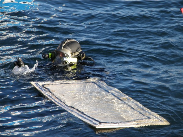 Kafarar á vegum Köfunarþjónustu Sigurðar snéru í dag Sölku GK yfir á hina hliðina þar sem hún lá á gatinu í Sandgerðishöfn. Var það gert svo hægt væri að setja fyrir það. Síðan tók ég myndir af því þegar kafarar fóru niður og settu fyrir gatið og er með myndir teknar í gegn um sjónvarpstæki í stjórnbíl Köfunarþjónustunnar, er sýna gatið, þær koma í næstu færslu hér á eftir.