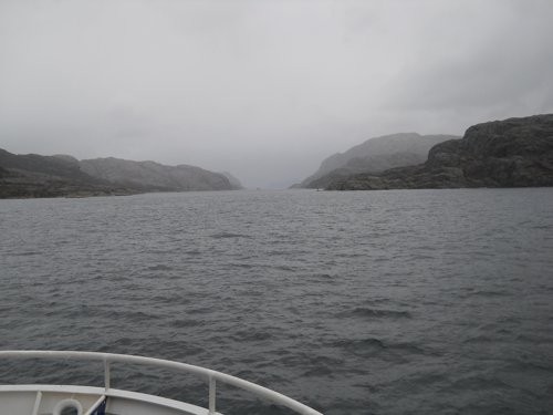 Á leiðinni til Florö eins og sjá má er nú ekki hægt að kvarta yfir veðrinu þarna, en inní þetta sund erum við að fara milli tveggja eyja veit ekki hvað heita.