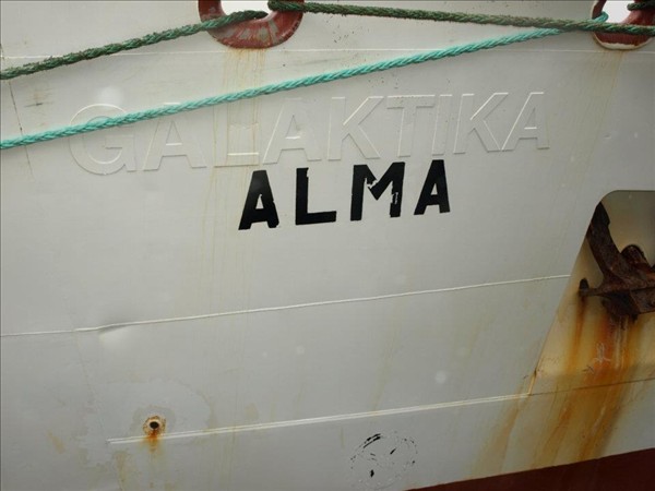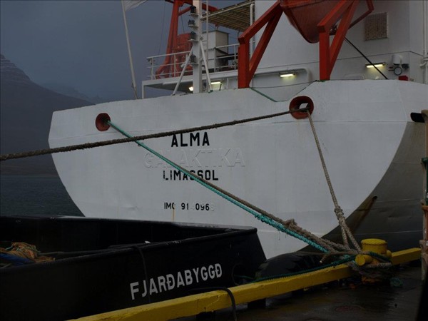 Alma missti stýrið við innsiglinguna í Hornafjarðarhöfn í fyrrinótt. Hoffellið dró skipið út á sjó, en dráttartaugin slitnaði um tveimur klukkustundum síðar. Um klukkan hálf fjögur í gær tókst svo að koma nýrri taug milli skipanna. Upphaflega stóð til að Alma yrði dregin að höfn í Reyðarfirði, en siglingin til Fáskrúðsfjarðar var styttri og þótti öruggari vegna veðurs.