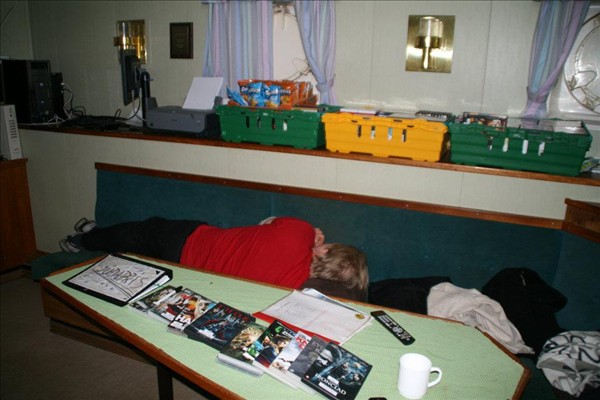 Bjarki stýrimaður sofnaður á bekknum einn ganginn enn, konan hans verður glöð þegar hann kemur heim alveg úthvíldur fyrir allt jólastússið