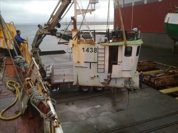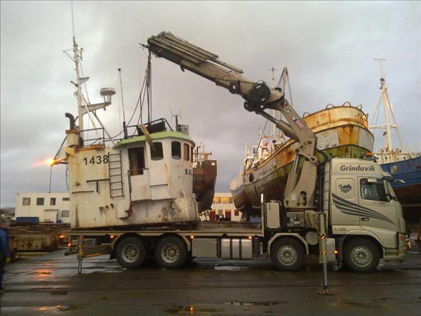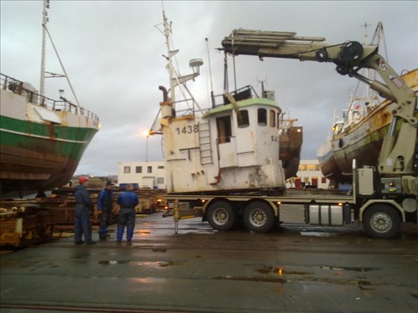 Húsið af 1438. Sölku GK 79, tekið af bátnum og sett á flutningavagn, í morgun © mynd Bragi Snær, 4. nóv. 2011