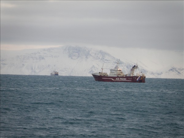Forsíða Fiskifrétta í síðustu viku. Á myndinni sést er 2643. Júpiter ÞH 363, er nánast kominn upp í klettana við Kiðey og 2411. Vilhelm Þorsteinsson EA 11, er alveg við hann © mynd Kristinn Benediktsson fyrir Fiskifréttir í nóv. 2011