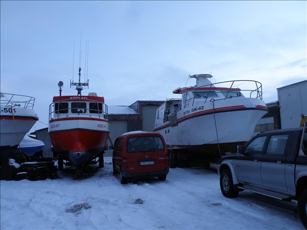Hér sést í fjóra af þeim bátum sem eru nú á útisvæði hjá Sólplasti í Sandgerði. Á vinstri hönd sést í 2704. Kidda Lár GK 501, þá er það bátur sem er unnin í íhlaupavinnu og hefur verið nefndur meðal manna sem Bjartsýni, 2106. Addi Afi GK 97 og 2622. Dóri GK 42, í morgun © mynd Emil Páll, 28. nóv. 2011