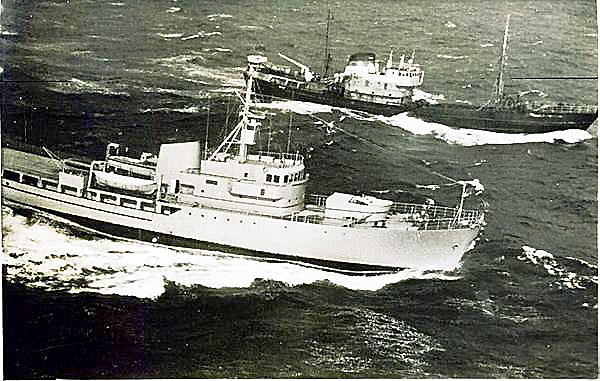 Myndir þessar sýna er togarinn 1556. Drangur SH 511 frá Grundarfirði kom með flutningaskipið Lóm vélarvana til Reykjavíkur 1995 © myndir Sigurlaugur