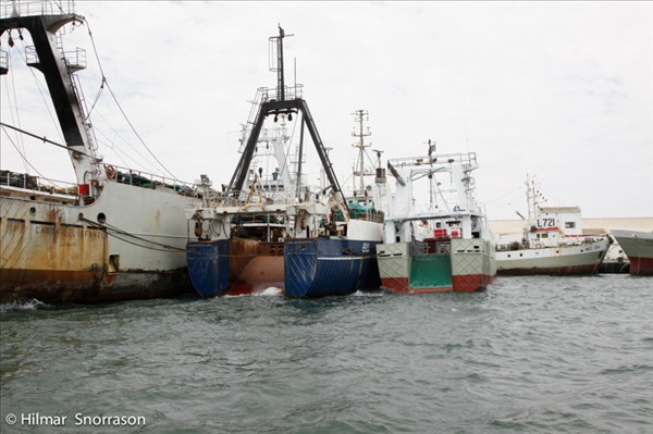 Sá blái er JSC 1 ex 1473. Hringur SH ex Hrímbakur EA ex Bjarni Herjólfsson ÁR, í Walvis Bay í Namibíu © mynd shipspotting Hilmar Snorrason, 26. okt. 2011