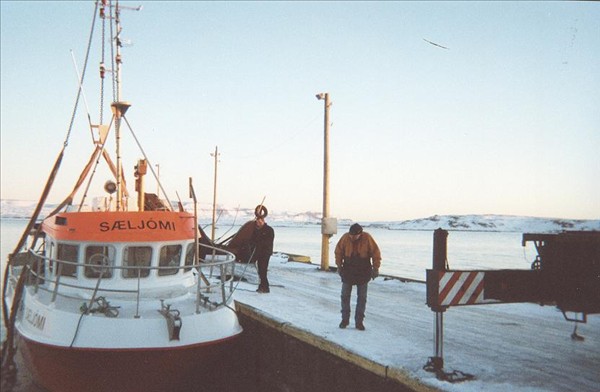 þessi mynd er stækkuð upp úr mynd úr syrpunni af sjósetningu Selmu ÍS, sem sýnd var hér fyrir nokkrum nóttum og sýnir Ellliða GK á sínum síðasta degi í Njarðvík því síðar þennan dag var hann dreginn í Hafnarfjörð þar sem hann var brotinn niður. Ef vel er skoðað má sjá að Kristbjörgin sem síðan fór í plássið er þarna utan á Elliða.